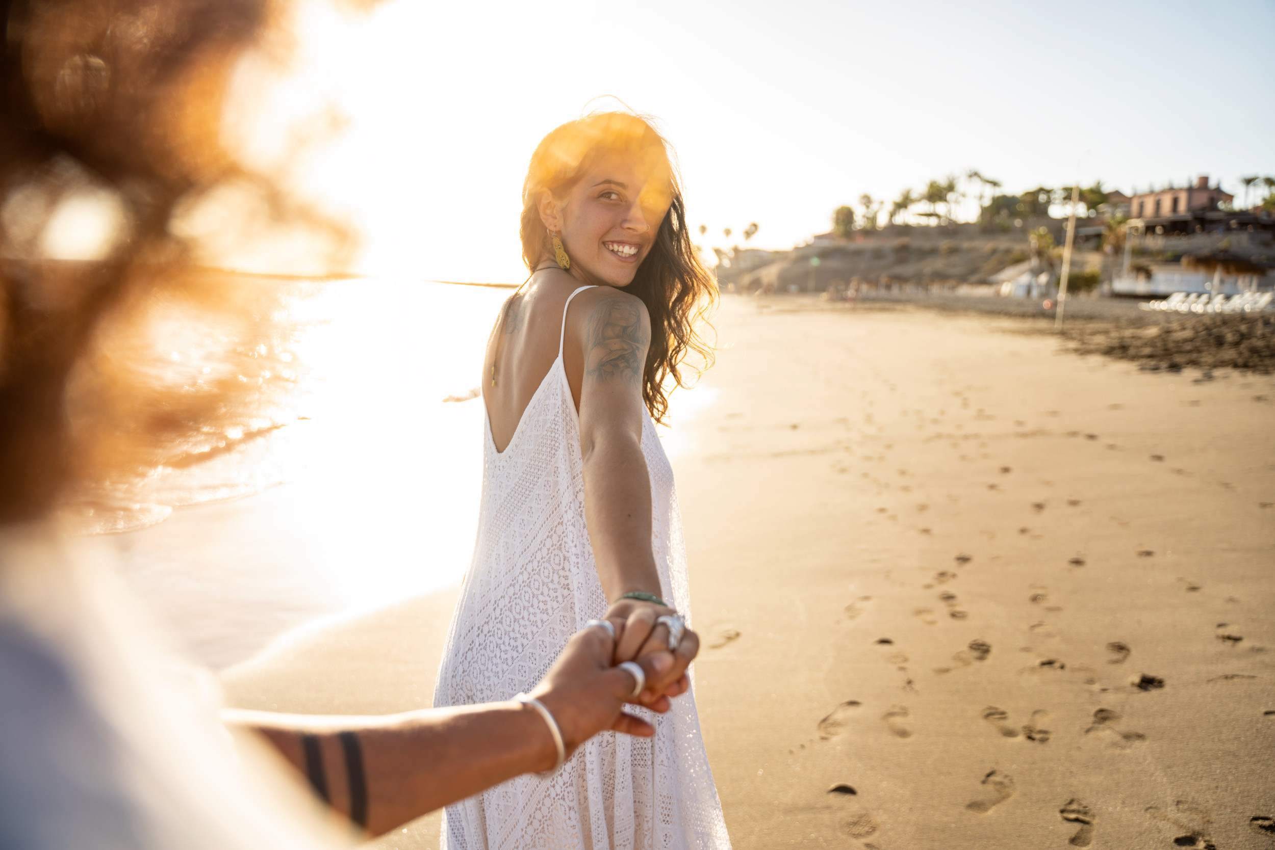 Foto de archivo: Una mujer joven camina por delante de la pareja en la playa y mira hacia atrás mientras se toma de la mano. Foto de archivo: Una mujer joven camina por delante de la pareja en la playa y mira hacia atrás mientras se toma de la mano. Getty Images