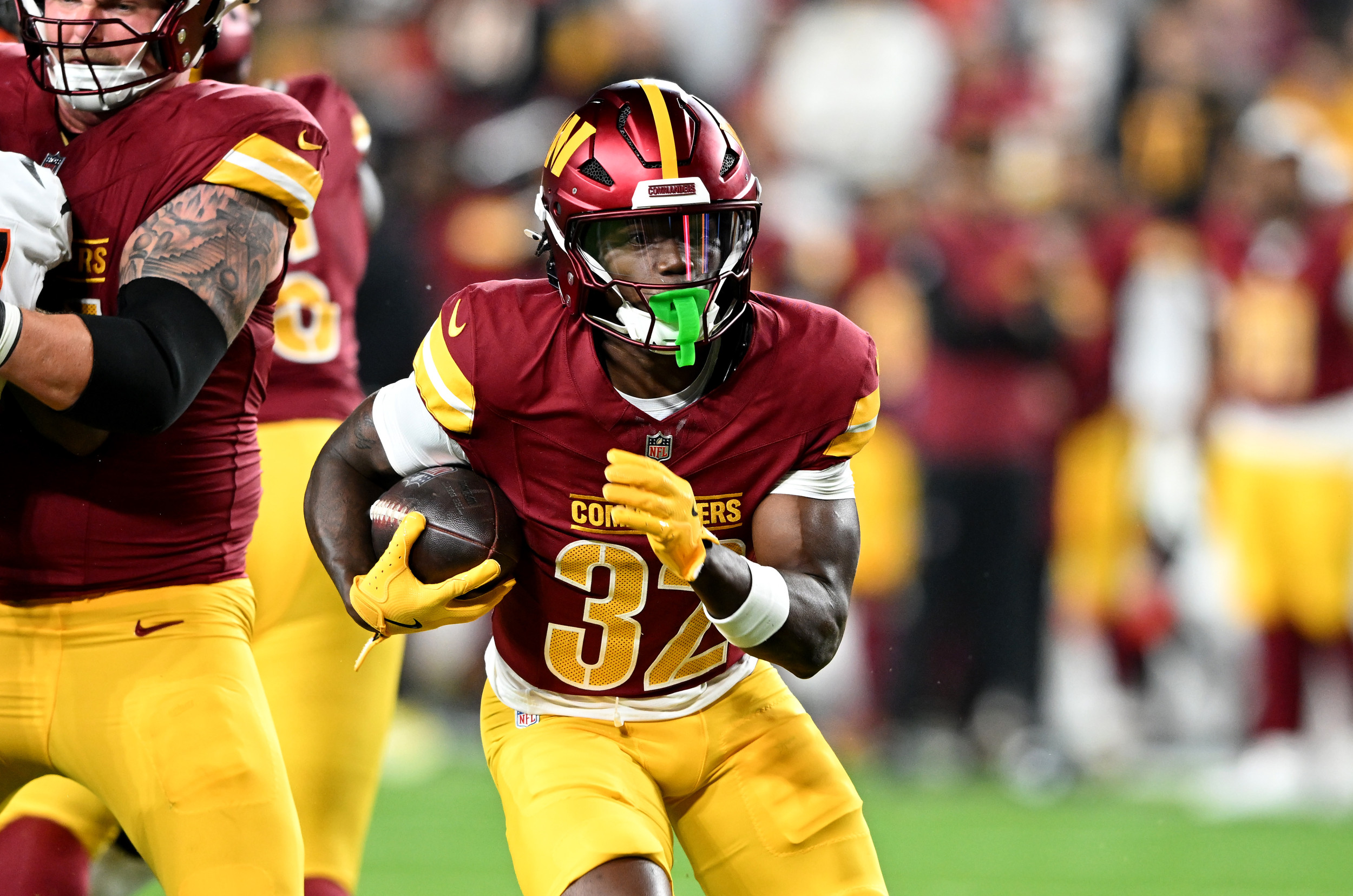Jacory Croskey-Merritt #32 de los comandantes de Washington se apresura a un touchdown en el primer cuarto contra los Bengals de Cincinnati durante el juego 2025 de pretemporada de la NFL el 18 de agosto de 2025 en Landover, Maryland. Jacory Croskey-Merritt #32 de los comandantes de Washington se apresura a un touchdown en el primer cuarto contra los Bengals de Cincinnati durante el juego 2025 de pretemporada de la NFL el 18 de agosto de 2025 en Landover, Maryland. Foto de G Fiume/Getty Images/Getty Images