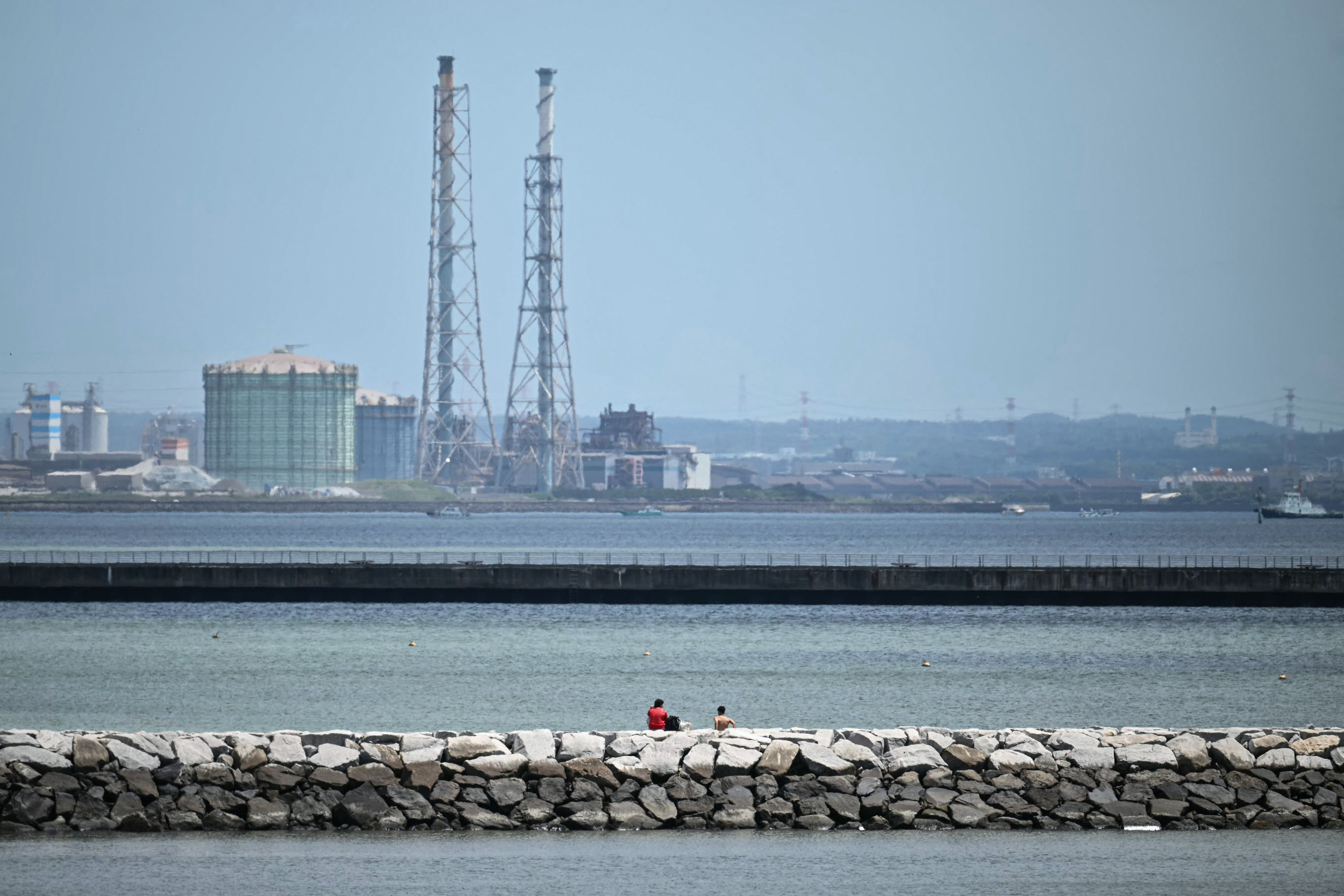 Se muestra a dos personas sentadas en un rompeolas después de que gran parte de la alerta de Tsunami de Tsunami después de un terremoto de magnitud de 8.7 en el mar del este de Rusia, a lo largo de la bahía de Tokio en la ciudad de Chiba, … Dos personas se muestran en un rompeolas después de que gran parte de Japón costera Japón se alerta de Tsunami después de un terremoto de 8.7 en el terremoto de la magnitud del mar. (Foto de Philip Fong/AFP a través de Getty Images) Más