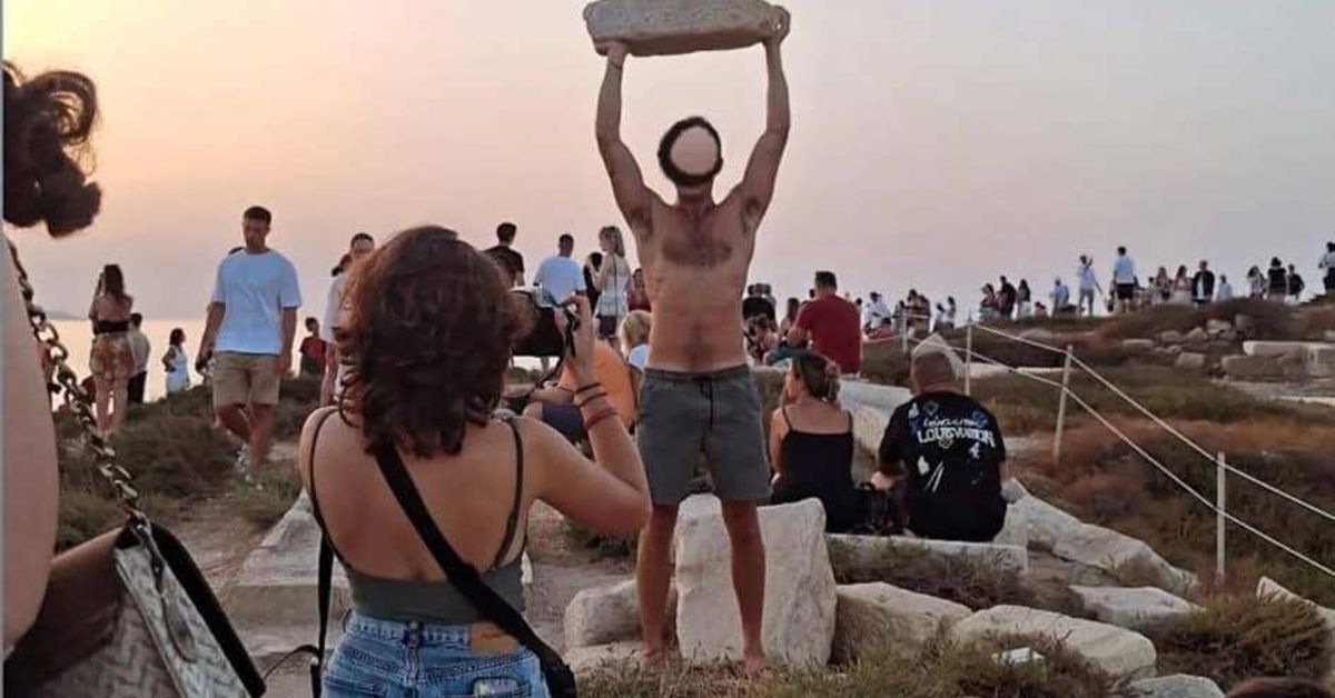 Una imagen del hombre misterioso circulaba en las redes sociales, con el turista sin camisa visto sosteniendo un fragmento de mármol fuera del templo de Apolo, también conocido como Portara.