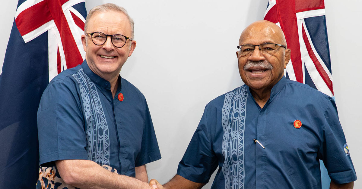 Anthony Albanese con el primer ministro de Fiji Sitiveni Rabuka. Las dos naciones están trabajando en un acuerdo de seguridad mejorado. (Anthony Albanese/X)