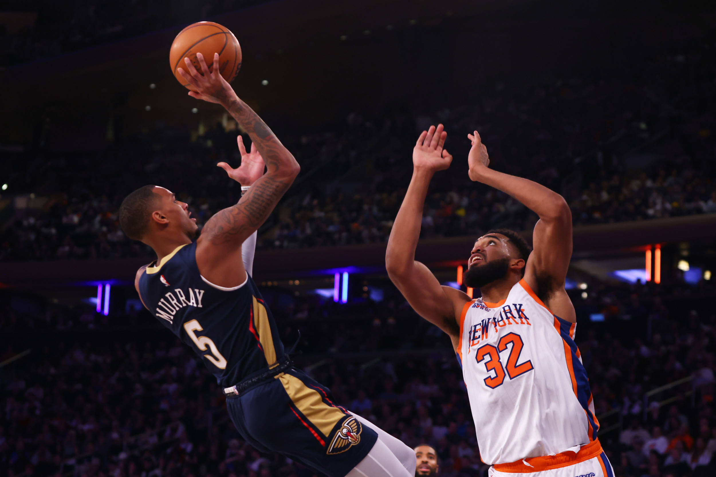 Dejounte Murray #5 of the New Orleans Pelicans drives to the net against Karl-Anthony Towns #32 of the New York Knicks during the second half at Madison Square Garden on December 01, 2024 in New… Dejounte Murray #5 of the New Orleans Pelicans drives to the net against Karl-Anthony Towns #32 of the New York Knicks during the second half at Madison Square Garden on 01 de diciembre de 2024 en la ciudad de Nueva York. Más foto de Mike Stobe/Getty Images