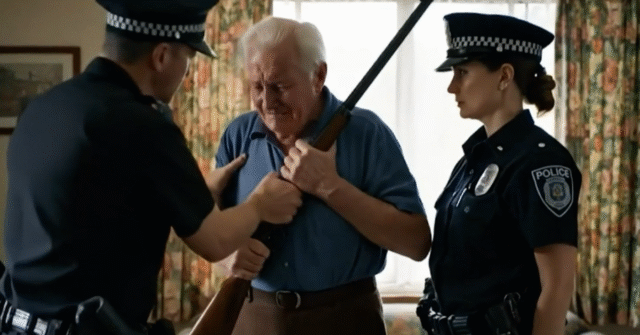 Otro muestra a los oficiales de policía retirando por la fuerza una escopeta de las manos de un hombre mayor.