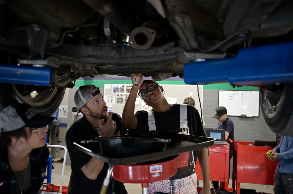 En el ala de servicios automotrices del campus durante una visita reciente, un grupo de estudiantes se acurrucó debajo de un vehículo encaramado en un ascensor hidráulico, ejerciendo herramientas mientras aprendían sobre cambiar el aceite de transmisión.