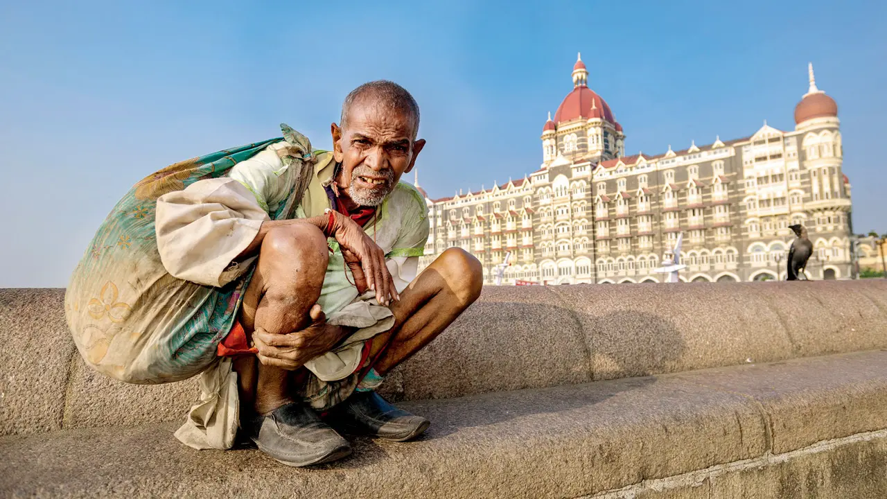 Alguna fotografía de contraste transmite la vulgaridad de la disparidad de la riqueza, dice Manu Joseph, como un mendigo fuera del lujoso Hotel Taj Mahal Palace en Colaba, o la disparidad entre las chawls de la ciudad y sus trajes de vaso, la camisa de pie. Fotos/getty imágenes
