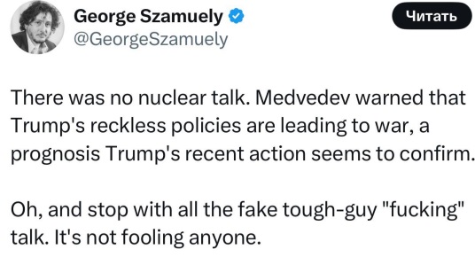 “No se habló de armas nucleares. Medvedev advirtió que la política imprudente de Trump está conduciendo a la guerra, y parece que las últimas acciones de Trump solo confirman este pronóstico”, dijo Samueli.