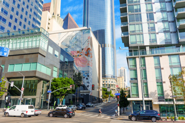 Stock Image: Una vista de gran angular de la bulliciosa intersección en West Fifth Street y South Olive Street en el centro de Los Ángeles el 3 de diciembre de 2024. Imagen de caldo: una gran vista de la bulliciosa intersección en West Fifth Street y South Olive Street en el centro de Los Ángeles el 3 de diciembre de 2024. Getty Images.