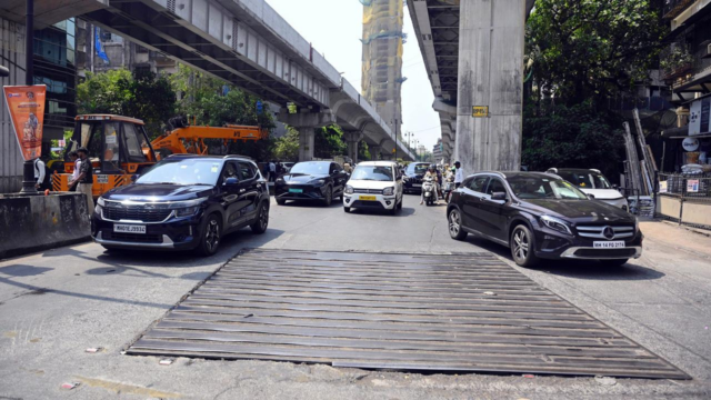 Dos placas de metal, utilizadas para cubrir los puntos de acceso al lado de salida de Worli Nalla, yacían en medio de la carretera frente a la antigua oficina de pasaportes en Worli, en el cruce entre Prabhadevi New Road y Annie Besant Road. Estas placas, de aproximadamente 10 pies por 12 pies de tamaño, tienen largas tiras de metal soldadas horizontalmente para proporcionar una mejor tracción a los vehículos.