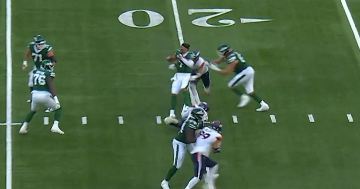 El mariscal de campo de los Jets tuvo problemas durante todo el juego con sus receptores abiertos, necesitando retener el balón por mucho más tiempo del que le hubiera gustado. Esto llevó a nueve capturas en el juego y Nik Bonitto agregó otra a su cuenta mientras persigue el récord de Michael Strahan.