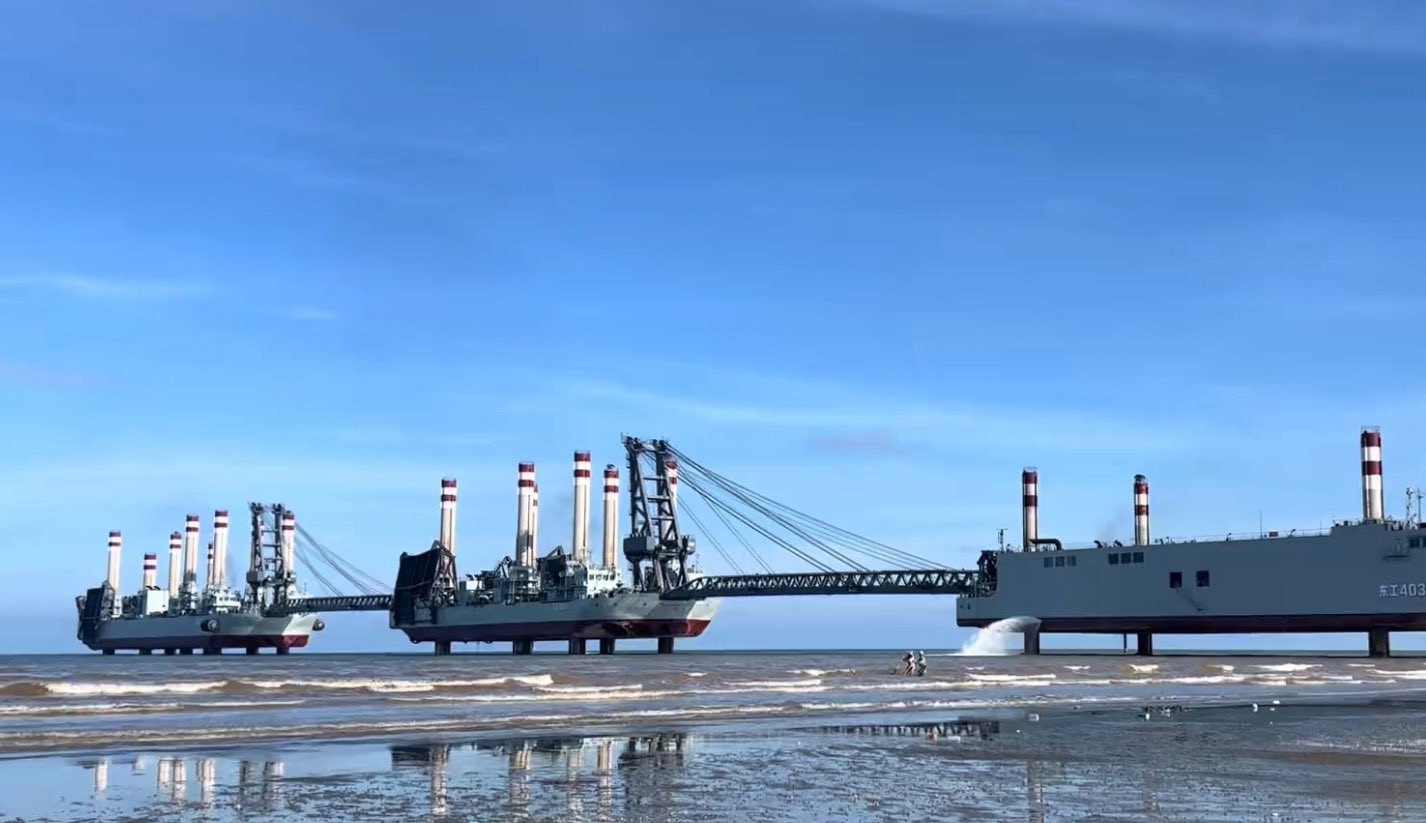 Una barcaza Shuiqiao funciona como un pontón temporal. Los tanques y otros vehículos blindados transportados a la costa por los barcos roll-on/roll-off de China podrían conducir sobre el puente y desembarcar más hacia el interior, pasando por las playas muy defendidas.