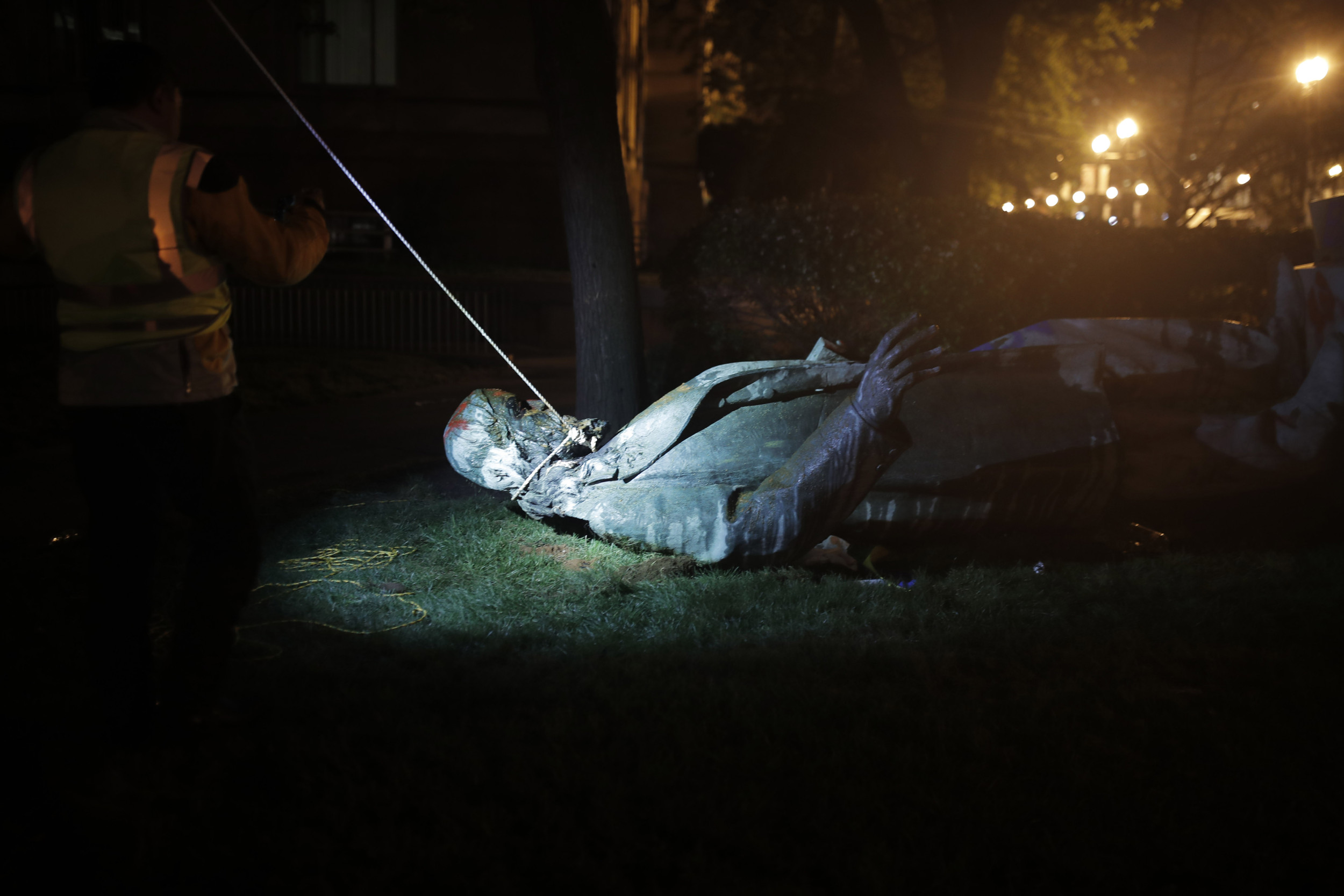 Las personas filman la única estatua de un general confederado, Albert Pike, en Washington, DC, después de que fue derribada por los manifestantes y se prendió fuego al 20 de junio de 2020. Las personas filman la única estatua de un general confederado, Albert Pike, en Washington, DC, después de que fue derribada por los protestantes y el fuego el 20 de junio, 2020. Maya Alleruzzo/AP/AP AP/AP AP/AP AP/AP AP/AP AP/AP AP.