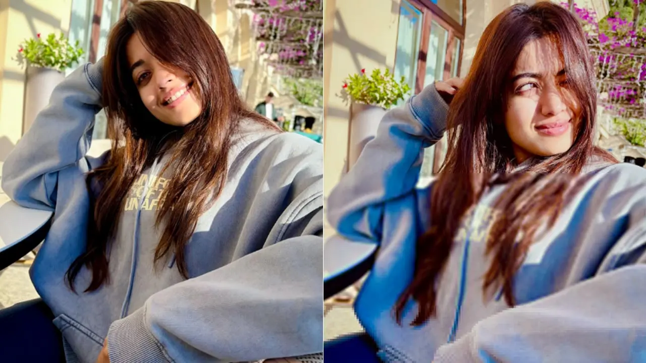 Las fotografías de primer plano de Rashmika la mostraban posando con una sudadera con capucha gris holgada, combinada con pantalones negros, haciendo algunas expresiones lindas y tontas.