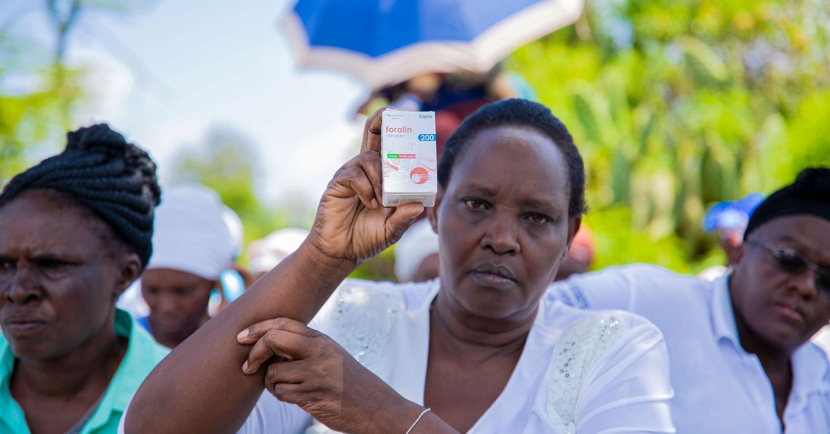 Una mujer kenia muestra a su inhalador. Ella dice que la mayoría de sus vecinos han desarrollado problemas respiratorios después del incendio. (Festo Lang para CNN a través de CNN Newsource) (CNN)