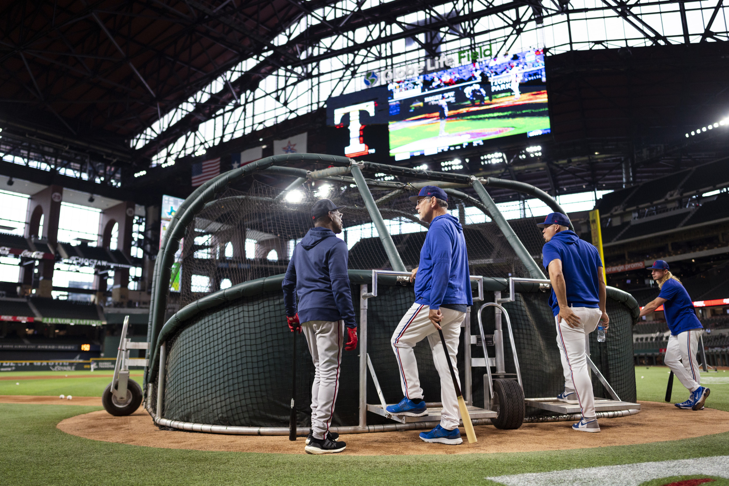 Ron Washington, del Atlanta Braves, habla con el manager Bruce Bochy #15 de los Rangers de Texas durante la práctica de bateo antes de un juego en Globe Life Field el 15 de mayo de 2023 en Arlington, Texas. Ron Washington, del Atlanta Braves, habla con el manager Bruce Bochy #15 de los Rangers de Texas durante la práctica de bateo antes de un juego en Globe Life Field el 15 de mayo de 2023 en Arlington, Texas. Ben Ludeman/Texas Rangers/Getty Images