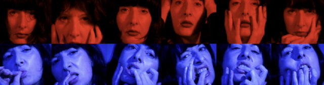 En ‘Período rojo’, Abramović aparece en primer plano, bañado en rojo monocromático. Con una sonrisa seductora, ella le da un gesto al espectador con una advertencia elevada de dedo, burlas, advertencia. Su expresión se transforma de tímido a confrontación a medida que la pantalla se desvanece a negra, revelando solo un fragmento de su rostro. Ella vuelve a emerger lentamente, su estado de ánimo oscilando entre encanto y fatiga: frotándose la cara, tirando de su cabello, mordiéndose el meñique. El simbolismo del rojo está multifacético aquí, más allá de hacer referencia a la energía y la vitalidad, se da un gesto hacia temas de feminidad y seducción, incluso invocando la luz roja a menudo asociada con el trabajo sexual y el anonimato.