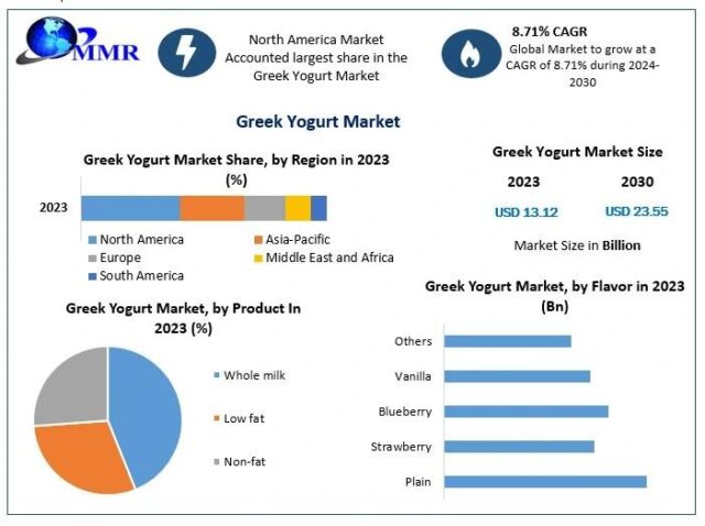 El tamaño del mercado de yogurt griego se valoró en USD 13.12 mil millones en 2023 y se espera que el mercado alcance USD 23.55 mil millones para 2030 a una tasa compuesta anual de 8.71 %