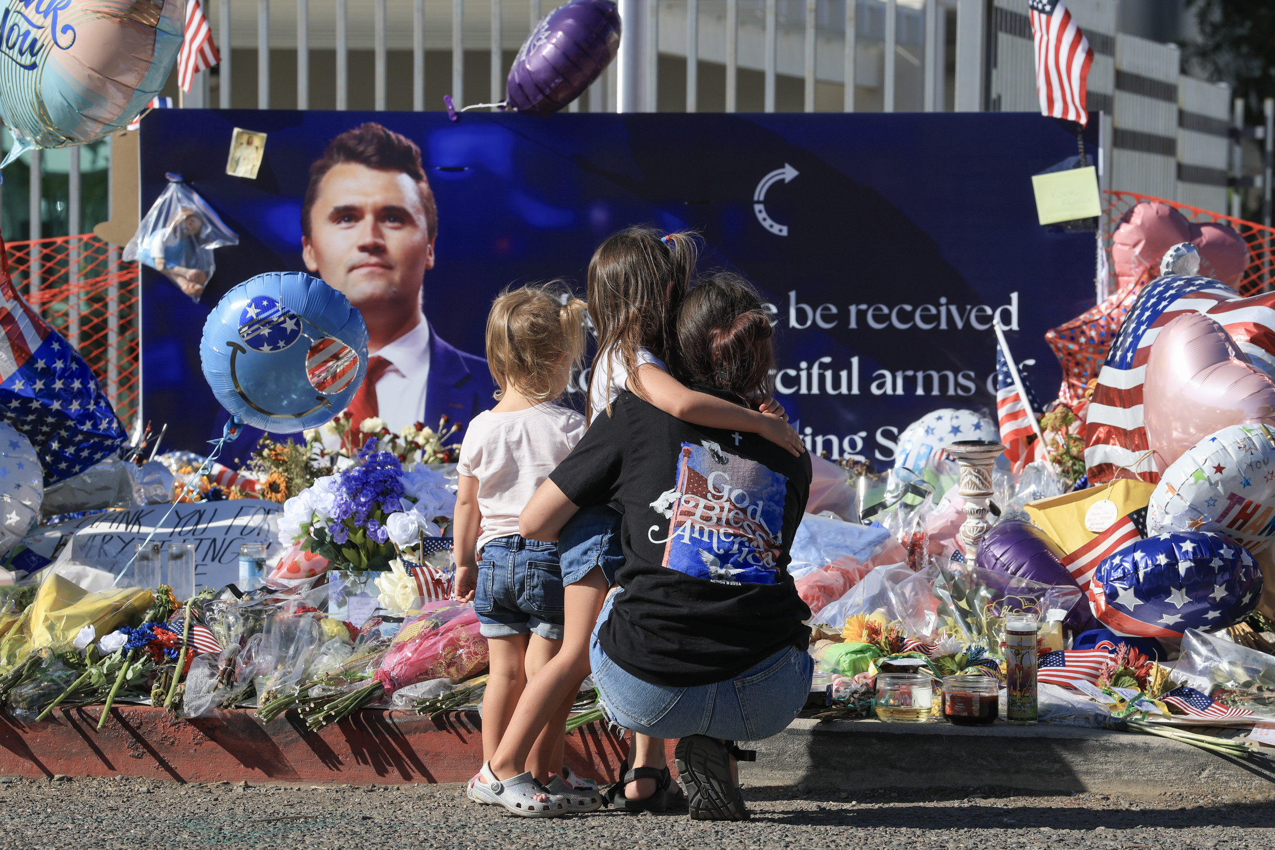 Una familia visita un monumento improvisado para Charlie Kirk fuera de la sede de Turning Point USA el 16 de septiembre en Phoenix, Arizona. (Foto de Joe Raedle/Getty Images) Una familia visita un monumento improvisado para Charlie Kirk fuera de la sede de Turning Point USA el 16 de septiembre en Phoenix, Arizona. (Foto de Joe Raedle/Getty Images)