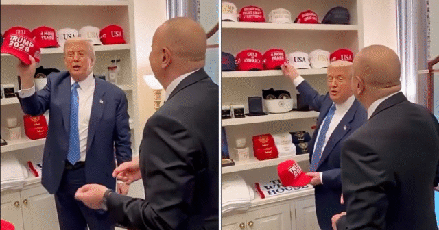 El presidente Donald Trump mostró la nueva mercancía en la tienda de regalos de la Casa Blanca el viernes, incluidos los sombreros que incluían referencias a un posible tercer término presidencial de Trump.