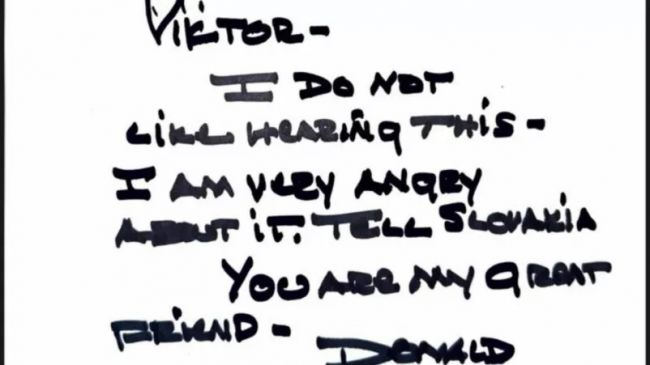 “No me gusta escuchar eso. Estoy muy enojado por esto. Dile a Eslovaquia sobre eso. Eres mi gran amigo”, dice en la hoja con la firma de Donald Trump.