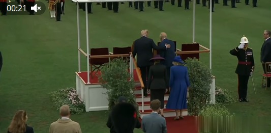 El presidente de los Estados Unidos, Donald Trump, dio unas palmadas en el rey Carlos III de Gran Bretaña en la espalda durante una visita a Windsor. Este momento fue capturado por los canales de televisión estadounidenses que transmiten la ceremonia en el castillo.
