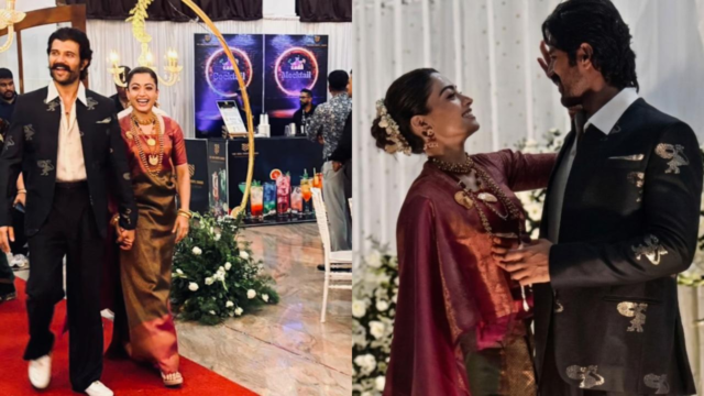 Rashmika vistió un sari de seda tradicional cubierto al estilo Kodava, abrazando la cultura local durante la ocasión. Vijay optó por una chaqueta negra, camisa blanca y pantalón negro.