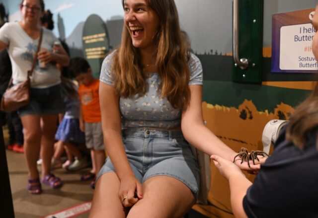 Los niños rebotaron en sus pies y se pusieron en los brazos de sus padres mientras Calais Lejeune, un educador y manejador de tarántula en el Pabellón de Mariposa, llevaba a Rosie más allá de la línea hasta la esquina, donde la gente puede sentarse y dar la bienvenida a la araña para caminar por su mano. Por ahora.