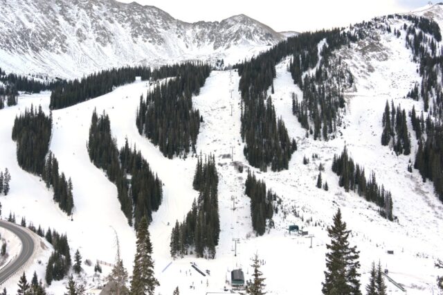 A-Basin informa una base de 21 pulgadas, aproximadamente la mitad de lo que normalmente tiene en esta fecha. Sólo nueve de sus 147 pistas están abiertas y cinco de nueve ascensores están en funcionamiento.