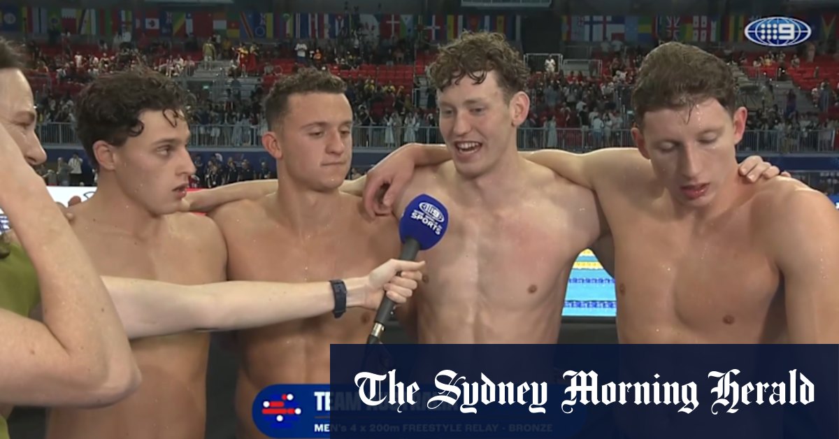 Flynn Southam, Charlie Hawke, Kai Taylor y Max Giuliani hablan con Cate Campbell después de reclamar el bronce en el relevo de estilo libre de 4x200m masculino en el Campeonato Mundial de Natación 2025.