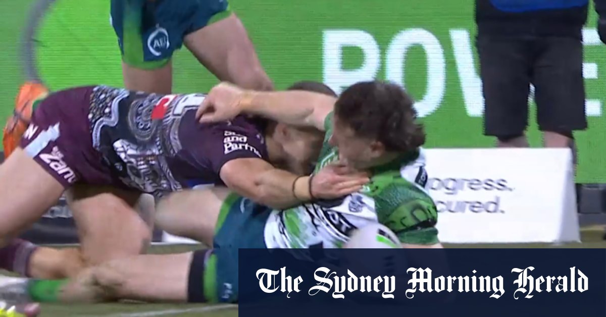 Raiders Young Gun Ethan Strange Powers para anotar su segundo intento contra las Manly Sea Eagles.