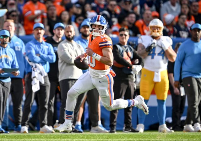 “Últimamente ha hecho un buen trabajo en eso”. Bo Nix (10) de los Denver Broncos lucha por ganar contra Los Angeles Chargers durante el tercer cuarto en Empower Field en Mile High en Denver el domingo 4 de enero de 2026. (Foto de AAron Ontiveroz/The Denver Post)