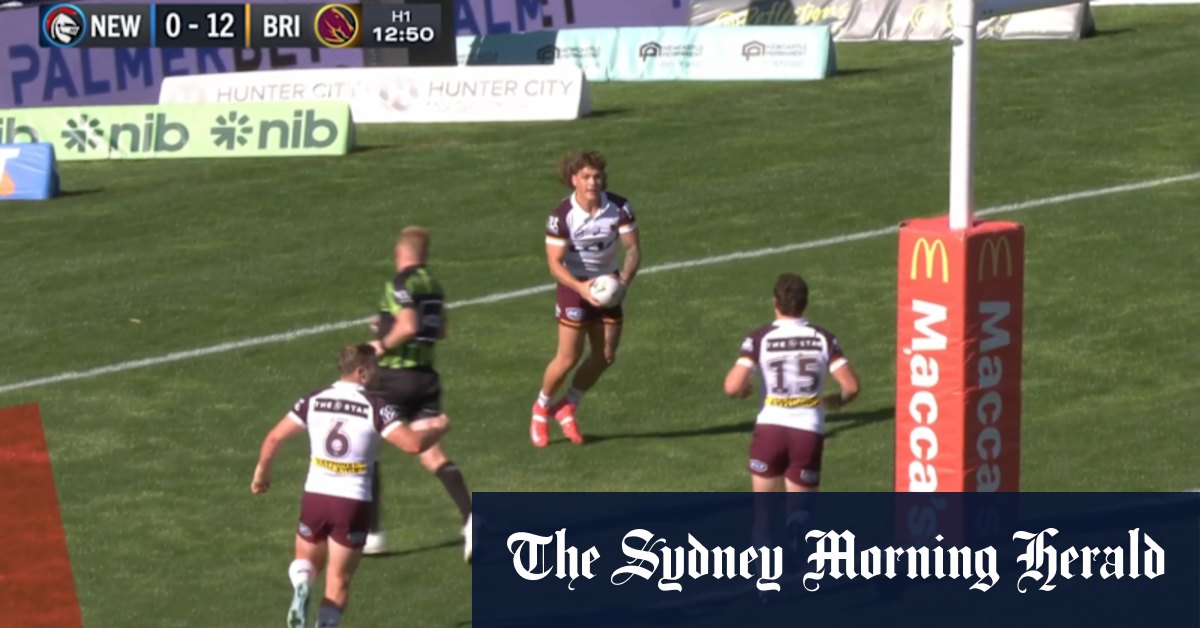 Reece Walsh se da un cierto intento por sí mismo y lo pasa al compañero de equipo de los Broncos, Kobe Hetherington.