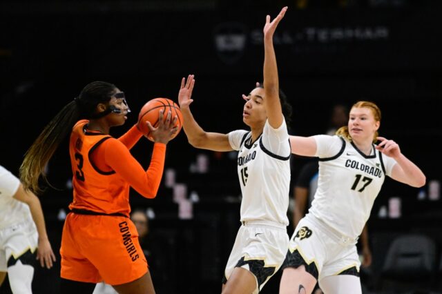 Jade Masogayo, de los Colorado Buffaloes, a la derecha, intenta bloquear un disparo de Haleigh Timmer, de las Oklahoma State Cowgirls, a la izquierda, en el CU Events Center en Boulder el domingo 25 de enero de 2026. (Matthew Jonas/Fotógrafo del personal)