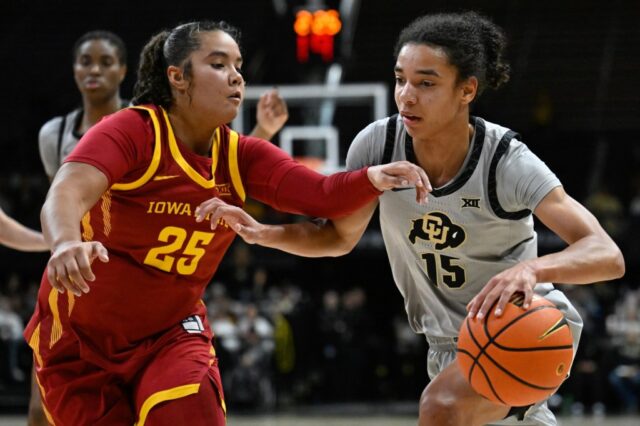 Zyanna Walker, de los Colorado Buffaloes, a la derecha, intenta disparar más allá de Audi Crooks, de los Iowa State Cyclones, a la izquierda, en el CU Events Center en Boulder el miércoles 14 de enero de 2026. (Matthew Jonas/Fotógrafo del personal)