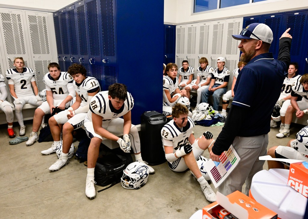 United For Evergreen Stickers adornó los cascos de los Caballeros de Silver de Severance que respondía a los Cougars Evergreen en el Stadium de Severance High School en Severance, Colorado, el viernes 26 de septiembre de 2025. El juego del viernes por la noche marca el primer juego jugado desde el tiroteo en la escuela secundaria Evergreen High School de septiembre de 2025 (Foto de Andy Cross/The Denver Post)