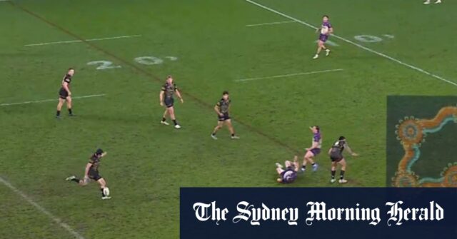 A Nathan Cleary se le niega un gol de campo después de que Moisés Leota se puso a la vez para bloquear a los defensores entrantes.