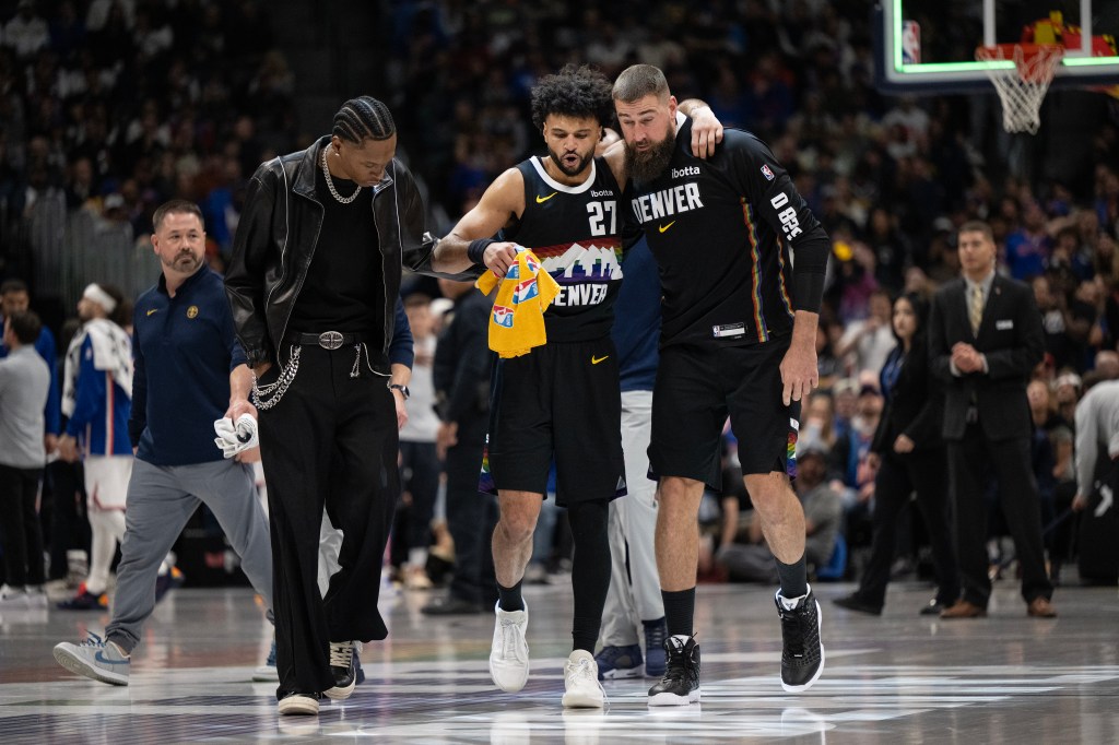 Jamal Murray fue ayudado a salir de la cancha durante el segundo cuarto de la derrota de Denver por 142-103 ante los Knicks el viernes. El base All-Star se torció el tobillo izquierdo, anunció el equipo, tras pisar el pie de Nikola Jokic mientras retrocedía en defensa.