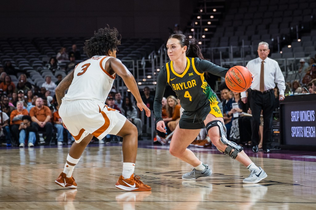 La escolta de Baylor, Jana van Gytenbeek (4), mueve el balón por la cancha contra Texas durante un partido de baloncesto de la NCAA el domingo 14 de diciembre de 2025 en Fort Worth, Texas. (Foto AP/Rich Rodríguez)