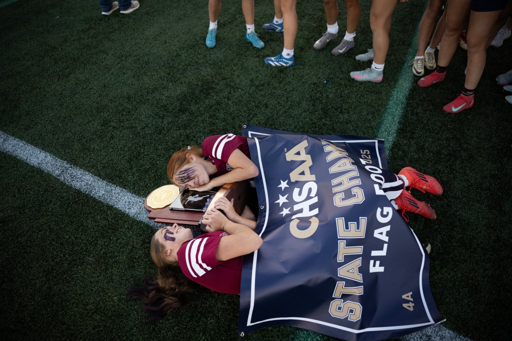 Los Titans ganaron cinco juegos consecutivos para cerrar la temporada con un récord de 16-3. Mountain View también terminó 16-3. Lydia Christensen (11) de The Classical Academy Titans levanta el trofeo después de que su equipo derrotara a los Mountain View Mountain Lions 34-0 para ganar el juego de campeonato estatal clase 4A el sábado 25 de octubre de 2025 en el Trailblazer Stadium en Lakewood, Colorado (Foto de Timothy Hurst/The Denver Post)