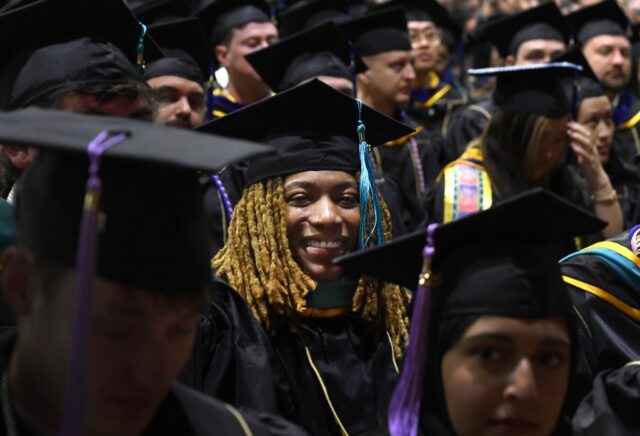 El presidente de la Universidad de Colorado, Todd Saliman (derecha), felicita a Jaylyn Sherrod mientras recibe una maestría en justicia penal de la Universidad de Colorado en Denver durante las ceremonias de graduación en el Centro de Convenciones de Colorado el 13 de diciembre de 2025 en Denver. (Foto de Kathryn Scott/Especial para The Denver Post)