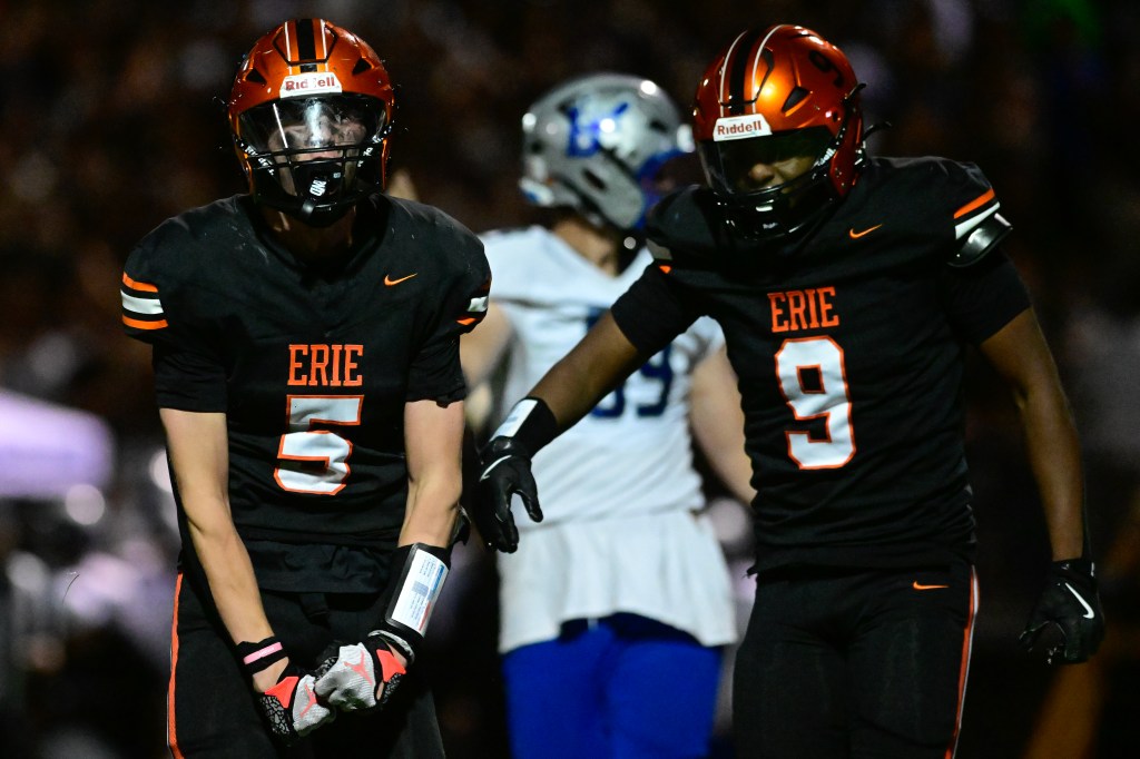 Erie’s Jack Arnold de Broomfield, a la izquierda, se entrega a Braylon Toliver, a la derecha, el viernes 26 de septiembre de 2025. (Matthew Jonas/fotógrafo del personal)