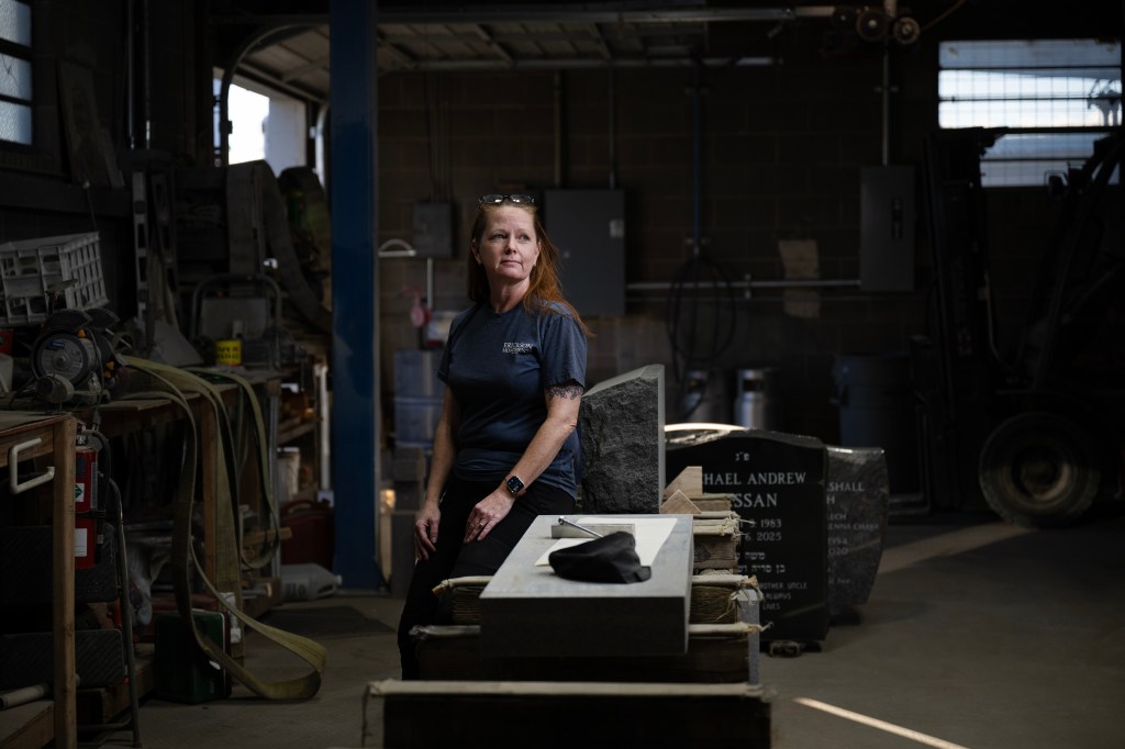 Justo al norte de SRM Concrete, en 1245 N. Quivas St., es donde se encontraban los Monumentos a Erickson. El sitio de Erickson Monuments, que ha operado en Denver durante cien años, fue comprado en 2024 por 4,7 millones de dólares como parte de una serie de adquisiciones de terrenos en Burnham Yard vinculadas a los Denver Broncos, que quieren construir un nuevo estadio en la zona. La propietaria del negocio en 1245 Quivas St. ahora está alquilando un terreno en 745 Vallejo St. y le preocupa tener que mudarse nuevamente. (Foto de Judith Kohler/The Denver Post)