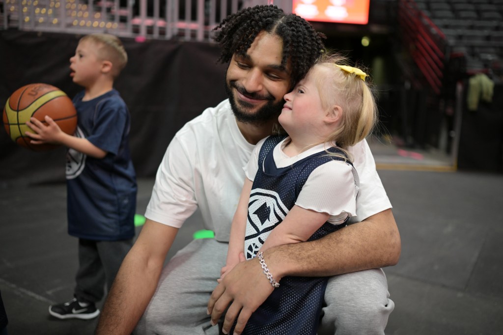 Charley Ager, de 4 años, derecha, encontró a su jugador favorito Jamal Murray durante la Clínica de Baloncesto de Olimpiadas Especiales en el Ball Arena en Denver el martes 10 de febrero de 2026. (Foto de Hyoung Chang/The Denver Post)