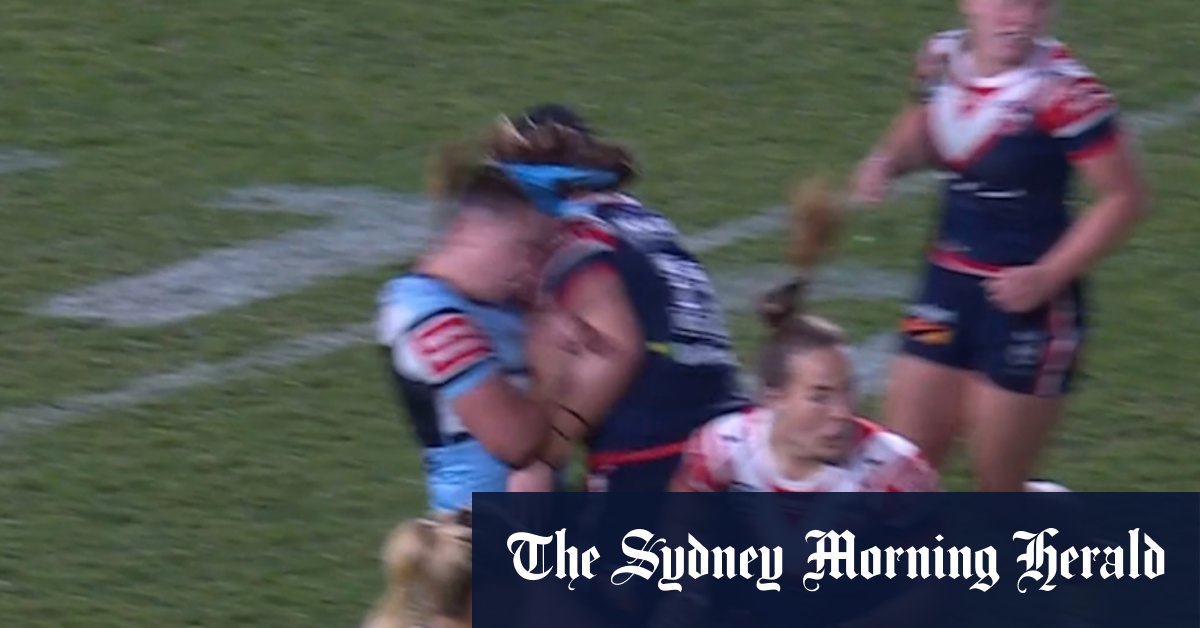 El alero de los gallos Aliyah Nasio recibe órdenes de marcha del árbitro después de una fea carga de hombro.