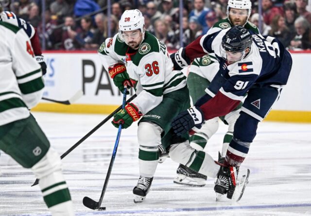 Con 7:41 para el final del segundo cuarto, el veterano delantero de los Avs se acercó y molestó al defensa de Wild Brock Faber detrás de la portería de Minnesota, interceptando el pase de Quinn Hughes para Faber en el proceso.