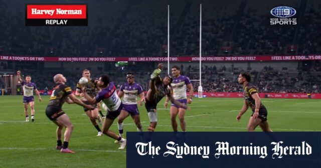 Xavier Coates recibe un intento contra los Panthers, a pesar de robar el balón en el concurso con Dylan Edwards.