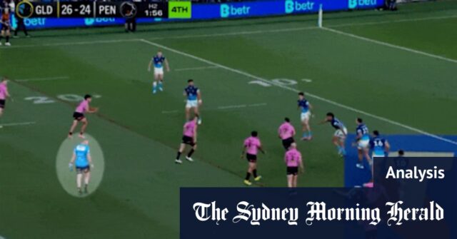 Aplicar seis: se mueve hacia la línea lateral cuando Mitch Kenny pasa a Nathan Cleary para el gol de campo de dos puntos. Cuando sale del campo, todavía está dirigiendo a los jugadores que protejan a Cleary y está en el campo de juego cerca de la línea lateral cuando el gol de campo es exitoso.