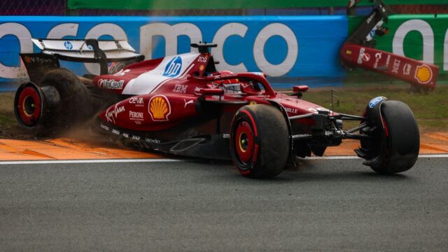 Leclerc salió de una parada en boxes por delante de Antonelli, quien intentó pasar a Leclerc en el interior de una esquina apretada, pero recortó su rueda trasera y envió el Ferrari a la barrera.