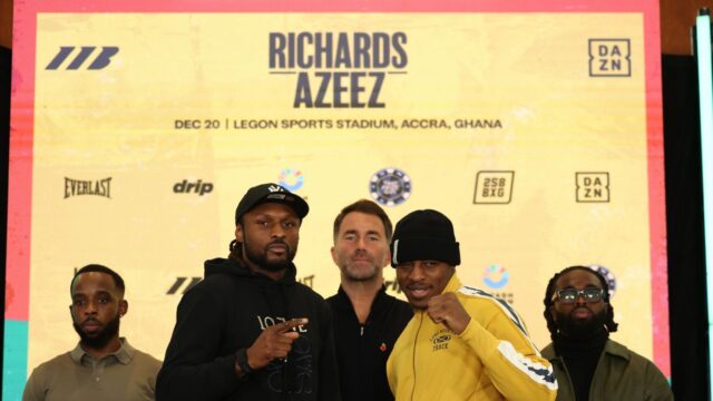 El sábado en Accra, Ghana, Matchroom organizará su primer evento en África con Craig Richards enfrentándose a Dan Azeez en un combate británico de peso semipesado. La noche siguiente, a unas 400 millas de distancia, en Lagos, Nigeria, el peso pesado británico Lawrence Okolie, promovido por Queensberry, encabeza contra Ebenezer Tetteh.