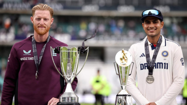 Los capitanes Ben Stokes y Shubman Gill fueron vistos posando con el Trofeo Pataudi y el Trofeo patrocinado.