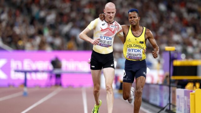 Tim Van de Velde, a la izquierda, se aseguró de que él y Carlos San Martin terminaran su carrera de obstáculos de 3.000 metros en el Campeonato Mundial. Franck Robichon/EPA/Shutterstock